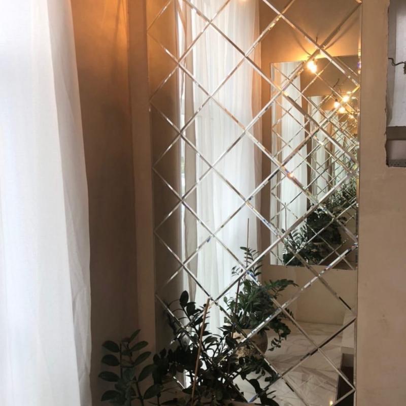 Использована серебристая квадратная зеркальная плитка размером 18х18.