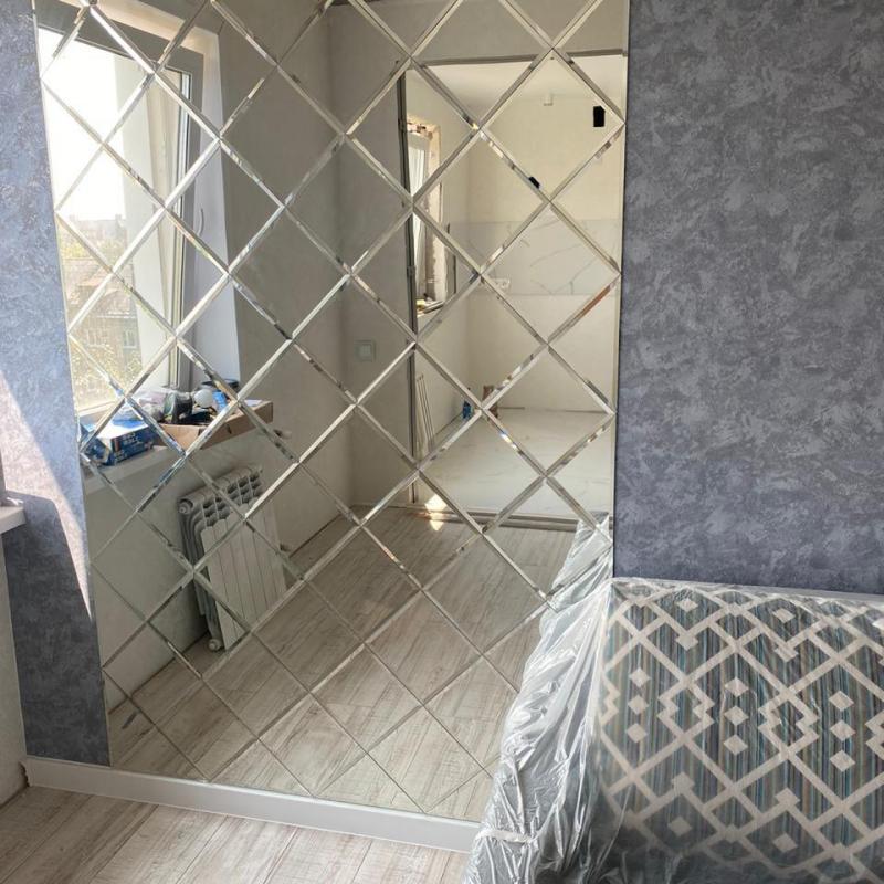 Использована квадратная серебристая зеркальная плитка размером 18х18.